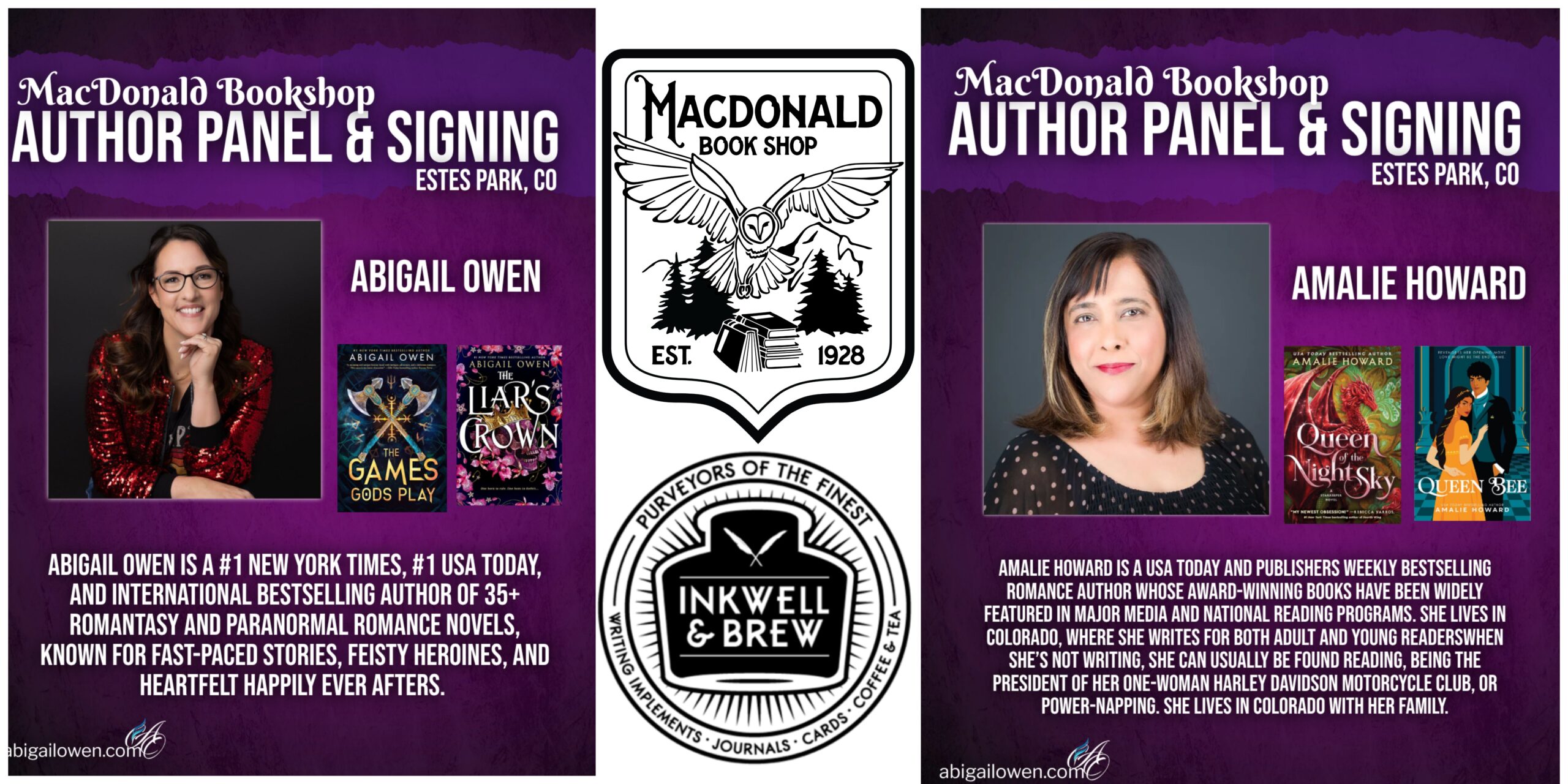 Inkwell and Brew 150 E Elkhorn Ave, Estes Park, CO, United StatesMacdonald Book Shop of Estes Park, Colorado is excited to host bestselling authors Abigail Owen and Amalie Howard this July at Inkwell and Brew! Spaces are limited, so please RSVP to secure your spot.